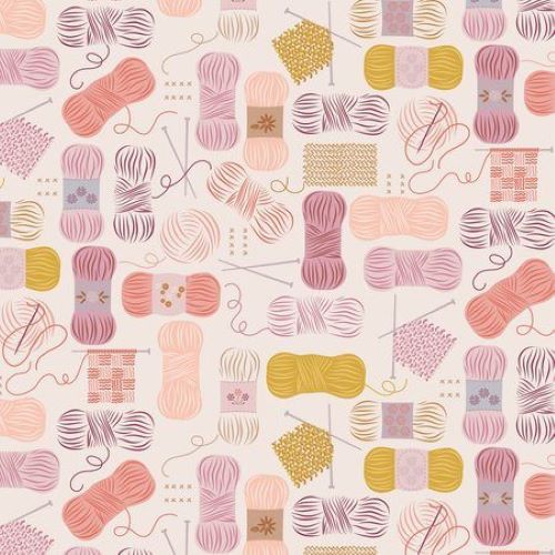 Er besteht zu 100 % aus Baumwolle, die Standardstoffbreite beträgt ca. 112 cm (44 Zoll). Wollknäule und Strickzeug in dezenten Farben auf hellgrauem Hintergrung