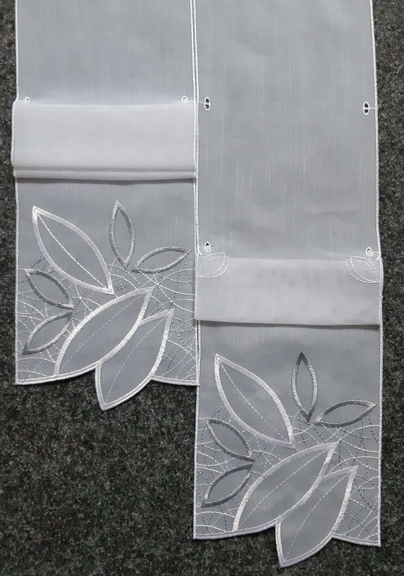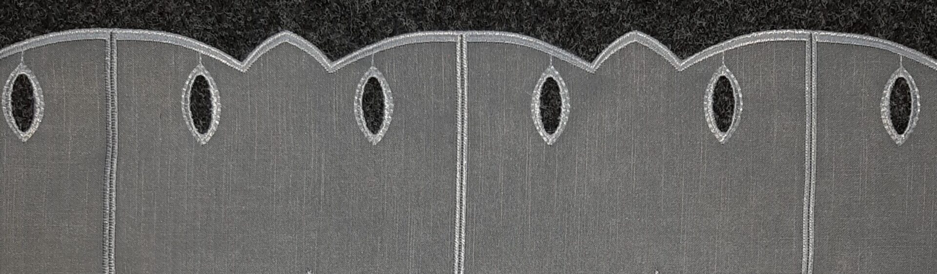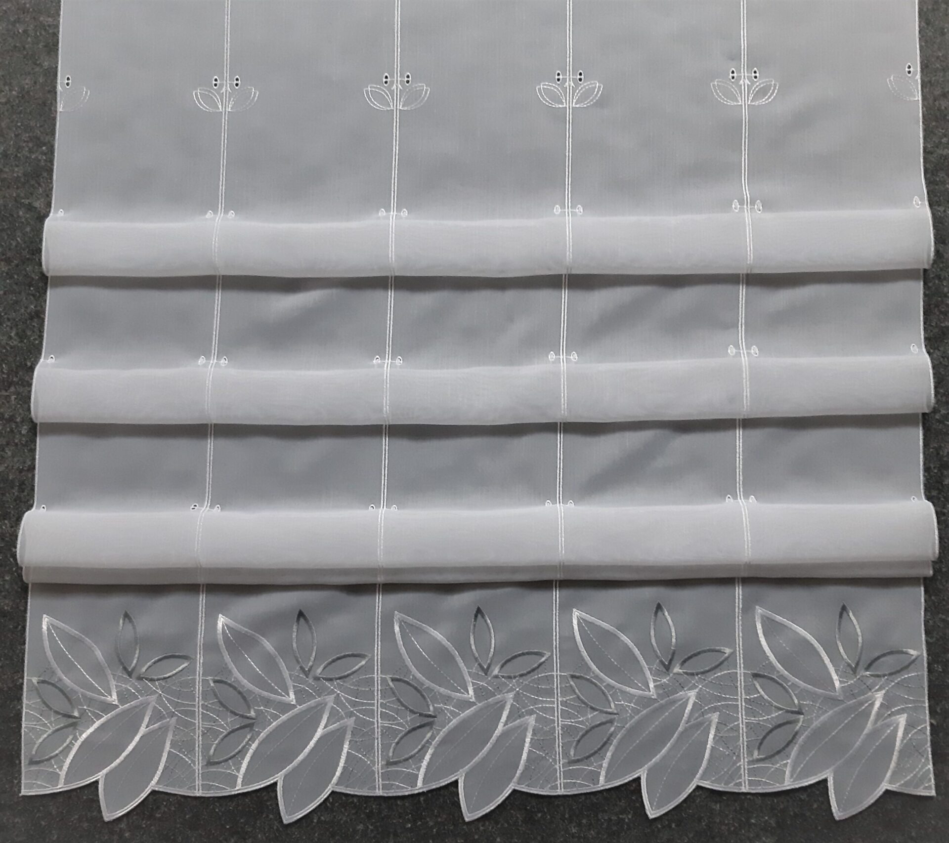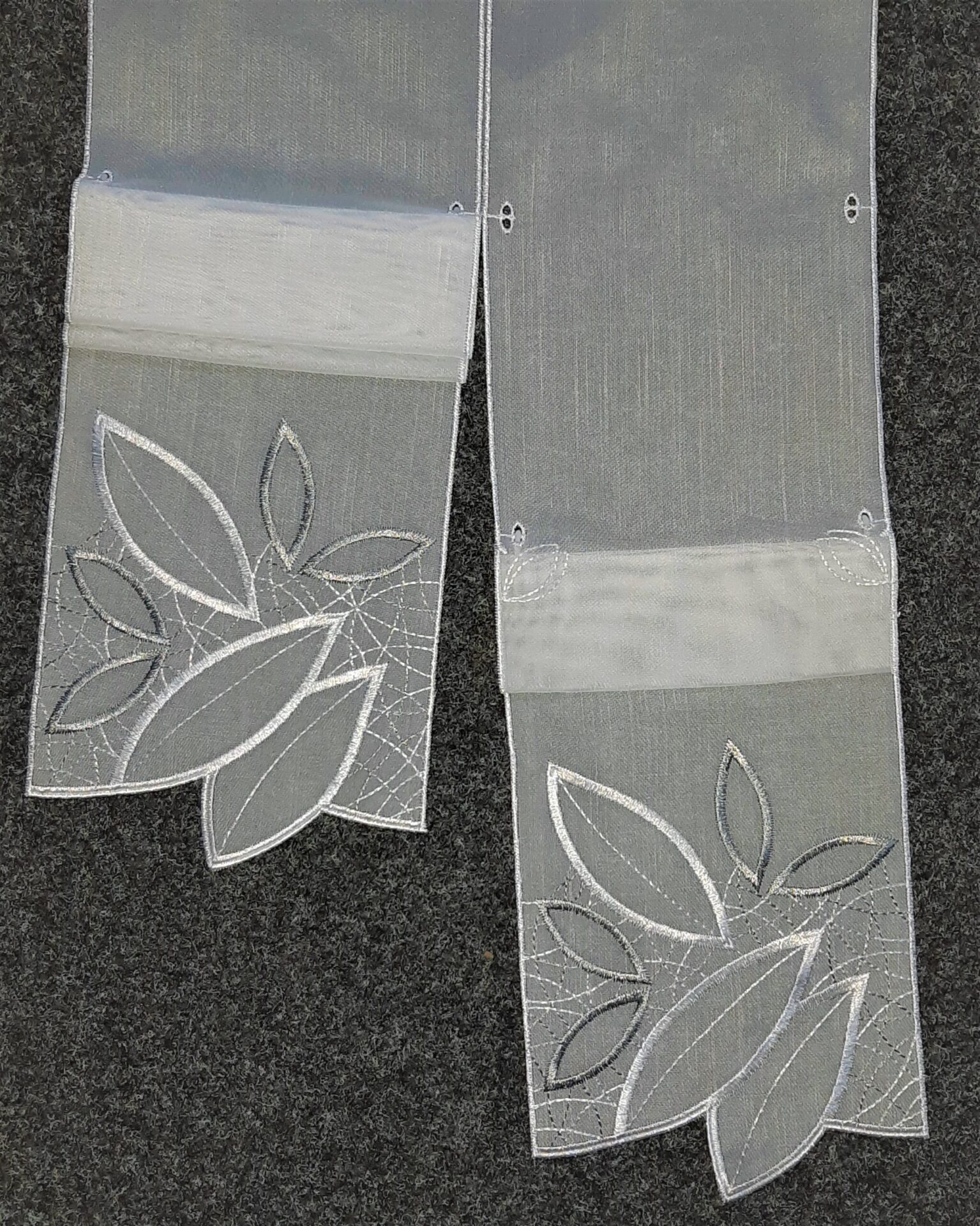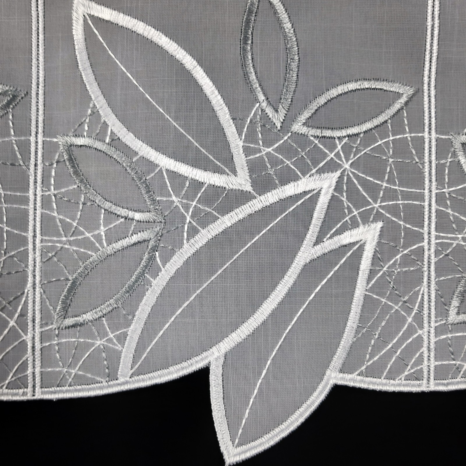 Dieses Raffrollo besticht mit seinem asymmetrischen Abschluss in modernem Blatt-Dessin und hochwertiger Plauener Stickerei-Qualität „Made in Germany“ .