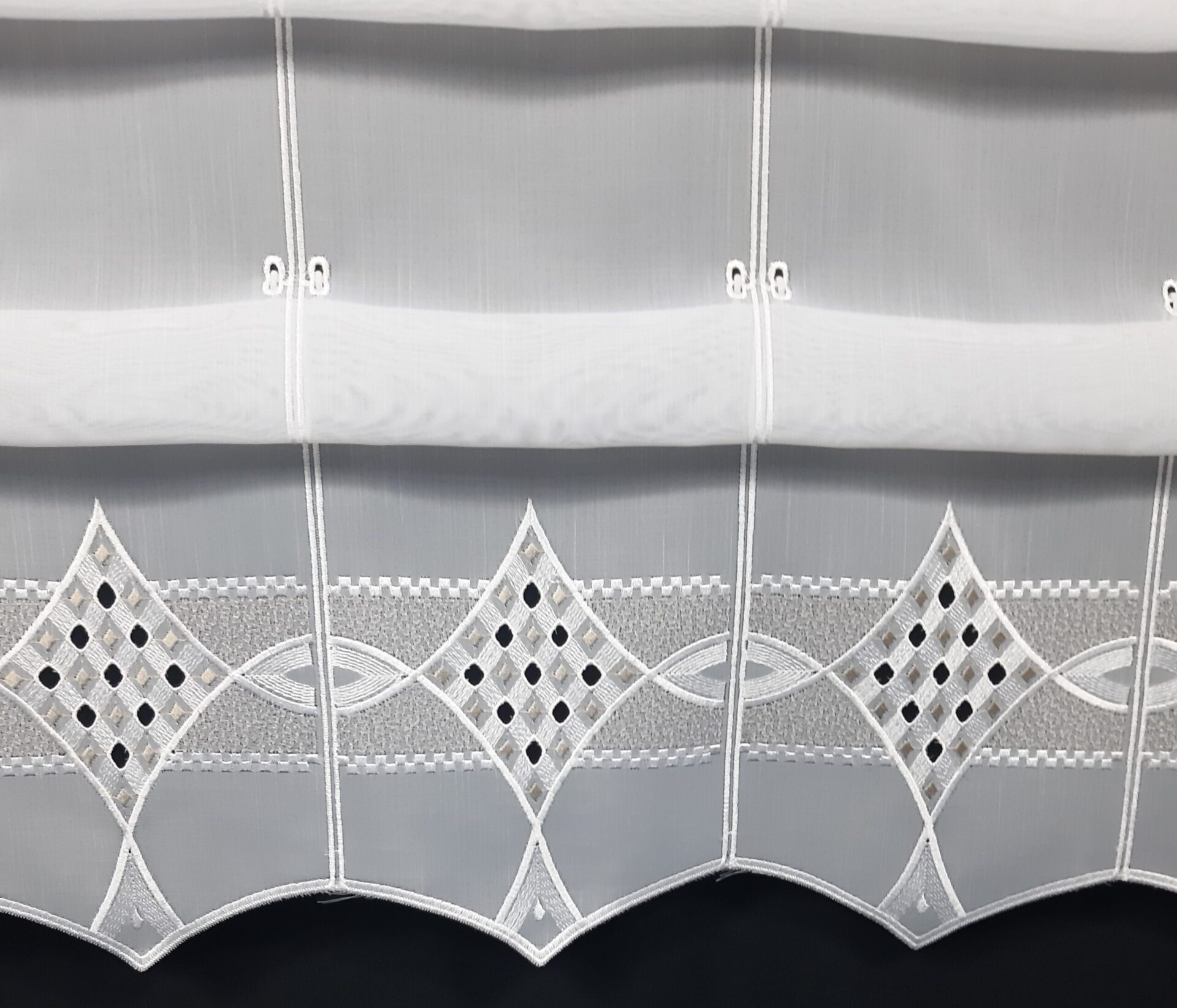 Die Gardine wird zwischen den 16 cm breiten Rapporten geschnitten und benötigt daher keine Seitennaht.